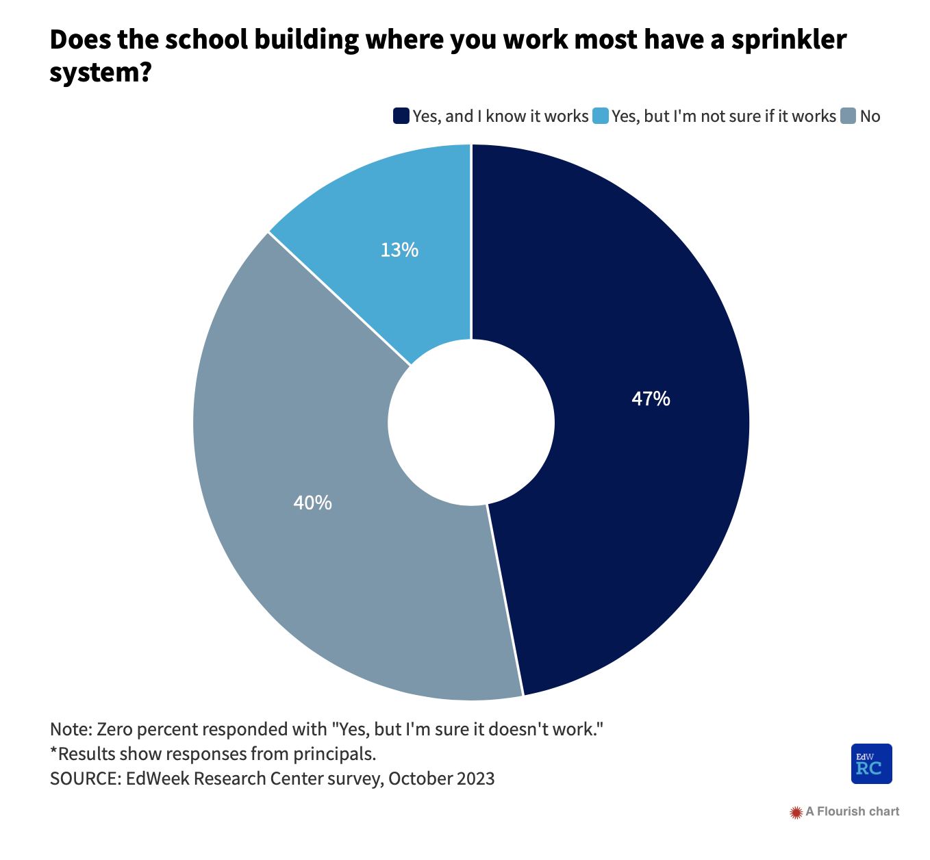A survey conducted in the fall by the Education Week Research Center asked school principals whether the building where they most often work has working sprinklers.